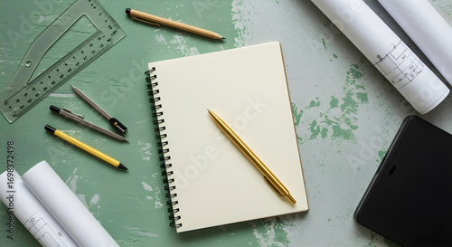 Golden Pen on Open Spiral Notebook with Sunlight and Green Marble Background