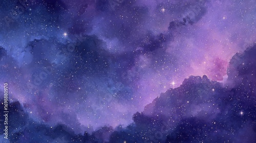 A swirling expanse of cosmic dust and gas in deep purples and pinks, illuminated by a multitude of twinkling stars, forming a mesmerizing and colorful galactic cloud