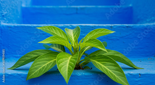 Resilient green plant sprouts from bright blue painted steps symbolizing growth and overcoming obstacles