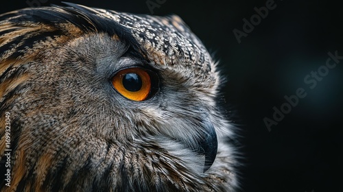 Profile portrait of owl with sharp feather details, intense gaze, and dark background, creating a dramatic and focused wildlife image.