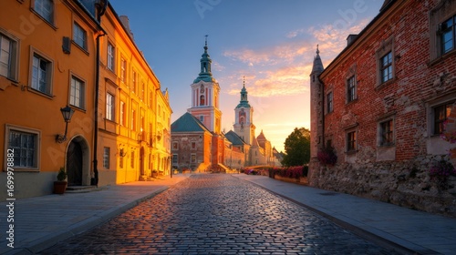 Cobblestone street leads to two church towers between colorful buildings at sunset