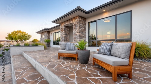 Elegant outdoor living space featuring luxurious stamped concrete patio and stylish seating for modern relaxation and entertaining