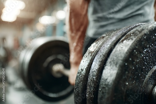 Close up of a muscular body lifting a heavy barbell with weight plates, glistening with sweat during an intense gym fitness workout session.