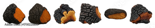Chaga mushroom set including whole, cracked exterior, and orange interior pieces isolated. Natural adaptogen and superfood collection.
