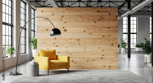 Living room interior in loft style with yellow armchair on empty wooden wall background.