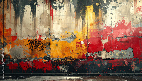 スプレーアート落書きが刻まれた古びた都会のグランジ壁 – Urban Grunge Wall with Weathered Graffiti Marks