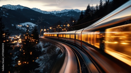 High-speed train at dusk on mountain curve with glowing lights and snowy peaks