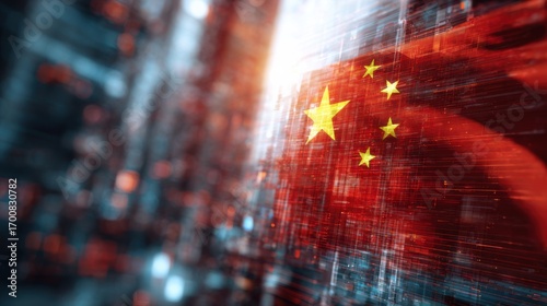 Digital representation of China's national flag with abstract elements in a futuristic setting