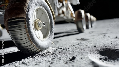 A close-up view of the wheel of an exploration rover on the lunar surface, bright soil contrasting with dark background,
