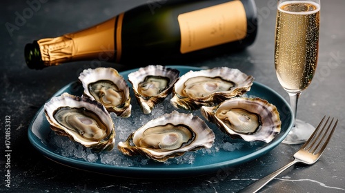 Fine dining oysters champagne display showing opened shellfish bedded on ice in teal plate, bubbling champagne glass, elegant fork, upscale restaurant marble surface backdrop