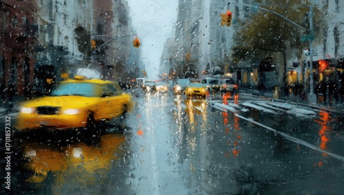 Rainy New York City street scene with iconic yellow taxi blurred by raindrops.
