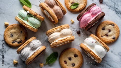 Premium ice cream sandwiches collection featuring mint chip, vanilla and berry flavors between chocolate chip cookies on elegant marble surface