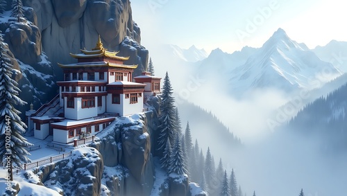 Epic 3D Render of Tibetan Monastery on Himalayan Hillside During Winter Snowstorm 3
