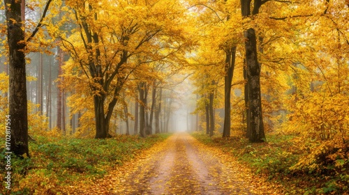 A serene pathway winds through a tranquil forest adorned with vibrant autumn leaves. Morning mist swirls among the trees, creating a peaceful atmosphere in nature.