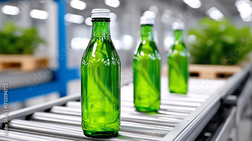 Green glass bottles on a production line, symbolizing beverage manufacturing and industrial efficiency.