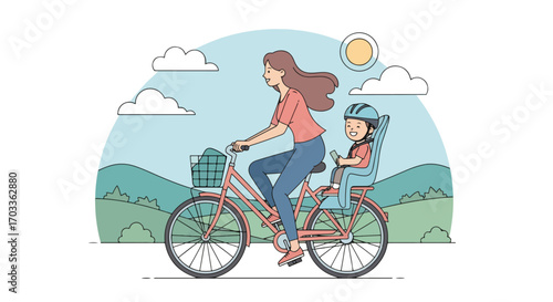 Adobe illustrator artwork vector illustration of a happy mother and child enjoying a leisurely bike ride outdoors. The mom cycles with her son securely seated in a child seat, emphasizing family fun