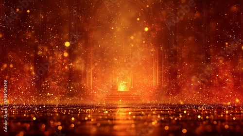 Glowing Indian temple interior filled with golden light, fire sparks and reflections, symbolic Dussehra holiday background representing victory of good over evil.