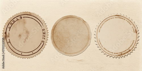 Three weathered circular vintage stamps display aged brown patina on textured paper.