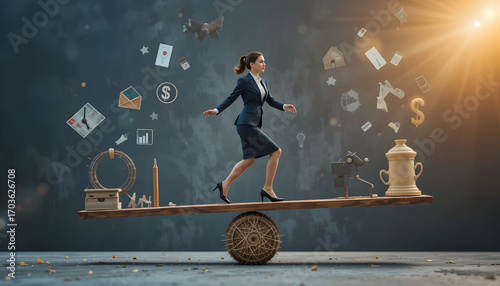 Businesswoman balancing work and life on a seesaw with icons floating around