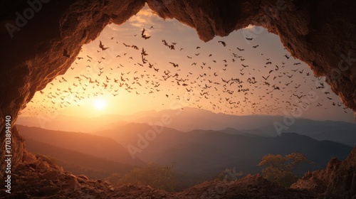 A breathtaking sunset illuminates mountains while thousands of bats take flight from a cave. The sky displays warm hues, creating a magical atmosphere in nature.