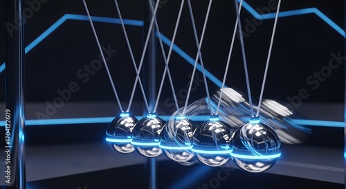Futuristic Newton's cradle with glowing blue spheres demonstrating the physics principles of momentum, energy transfer, and a perpetual chain reaction