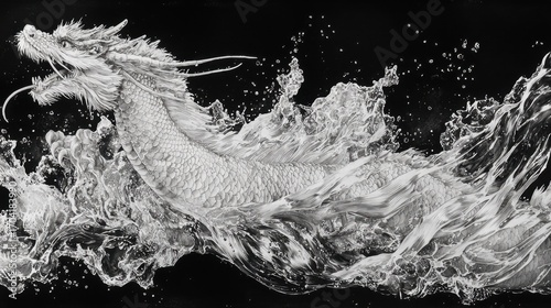 Majestic dragon emerging from turbulent waves in an intricate black and white artwork