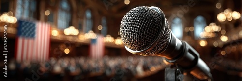 Microphone positioned in legislative chamber with flags and assembly members engaged in discussion