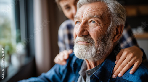 A senior man sits with a young adult placing a hand on his shoulder showing gentle support their upper bodies partially visible a window with curtains in the background support