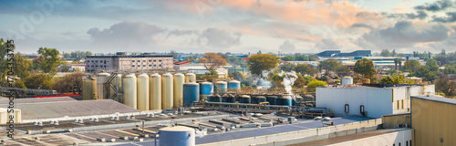 aerial view of industrial neighborhood in Gaborone, brewery tanks in the factory, African developments in Botswana