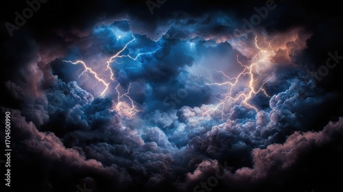 Dramatic lightning strikes illuminate a turbulent, dark sky filled with heavy, brooding storm clouds.