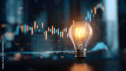 A glowing light bulb symbolizing innovative ideas and growth, set against a digital financial chart background.