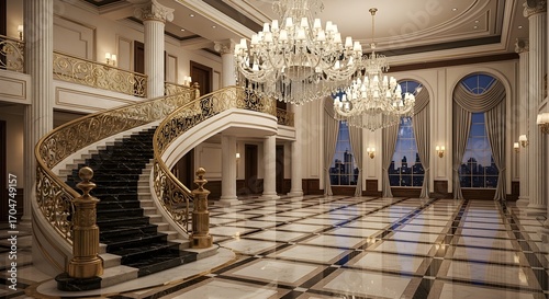 Elegant grand staircase with ornate gold railing in a luxurious ballroom with chandeliers and city skyline view