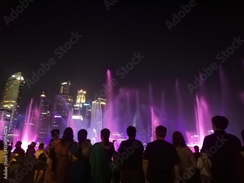 Nighttime Water Fountain Spectacle: Illuminated fountains erupt in a vibrant display against the backdrop of a cityscape at night, captivating a crowd of spectators.