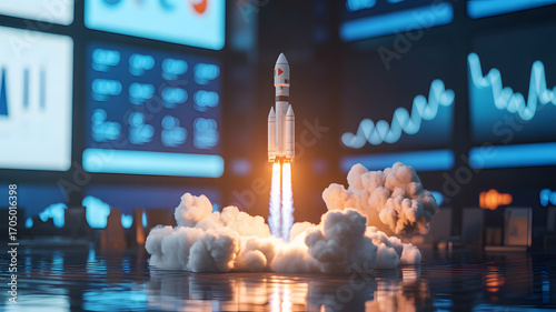 A rocket launching with bright flames and smoke against a backdrop of digital screens displaying charts and graphs, symbolizing innovation and progress