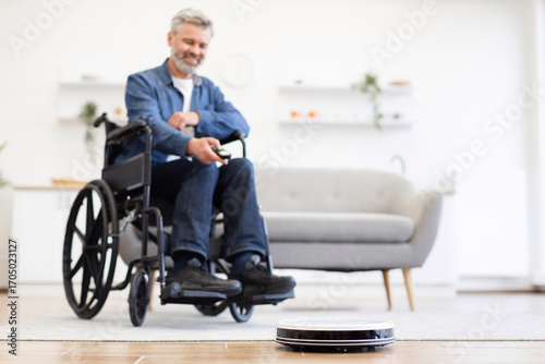 Senior man in wheelchair cleaning modern living room floor using robot vacuum, emphasizing independence aided by technology and innovation, reflecting concepts of smart home, accessibility