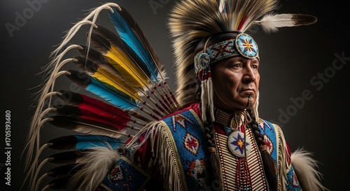 Portrait of a Proud Indigenous Man in a Vibrant, Feathered Ceremonial Headdress.