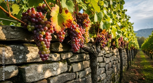 Closeup of a vineyard with ripe grapes hanging from the vines, showcasing the beauty of viticulture and the promise of a bountiful harvest in a picturesque countryside setting