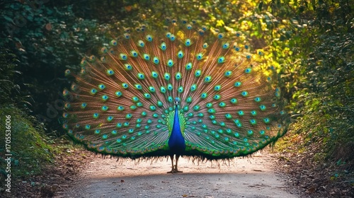 Majestic peacock displaying its plumage on a sun-dappled path amidst lush greenery