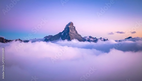 Majestic mountain peak piercing through a sea of clouds, bathed in the soft glow of a sunrise/sunset sky