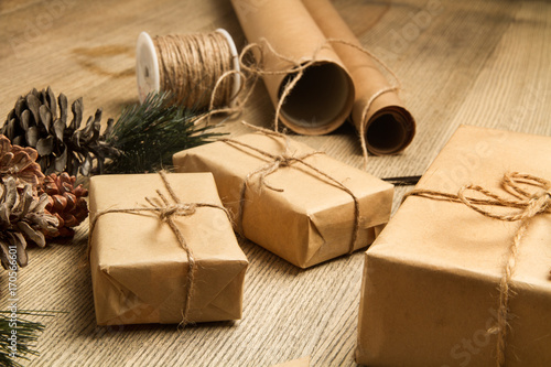 Preparación paquetes envueltos para regalos para Navidad. Vista de frente