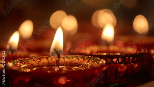 Diwa;i- Close-up of colorful, intricately painted diyas with flickering flames casting warm golden light, highlighted by soft bokeh and shallow focus, celebrating Diwali’s spirit of light, beauty