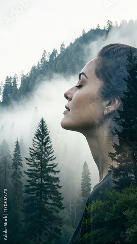Jedność z naturą. Podwójna ekspozycja portretu kobiety i mglistego lasu.
