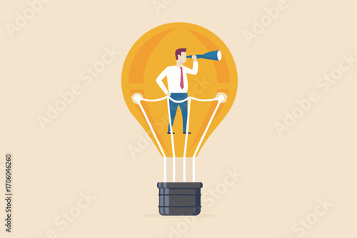 Businessman inside a light bulb looking through a telescope for new ideas and opportunities