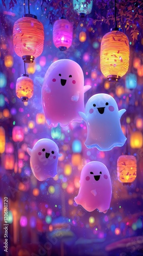 Un grupo de espíritus sonrientes flotan entre faroles de papel iluminados.