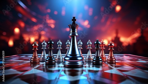 3d rendering of a chessboard with black and silver chess pieces the background is a blurred out glowing red and blue