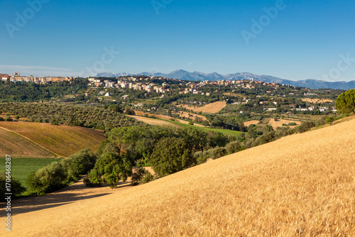 Countryside landscape with a harvested golden field in the foreground and a view of the city of Macerata on top of the hill with cultivated fields in the Marche region of Italy