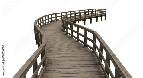 Discover serene pathways with this rustic wooden boardwalk curving gracefully into the distance.
