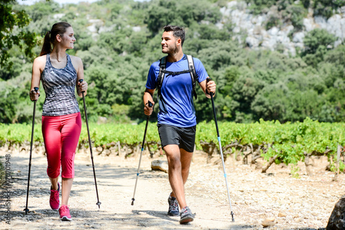beautiful young couple sport fitness nordic walking and exercising together outdoor summer countryside forest