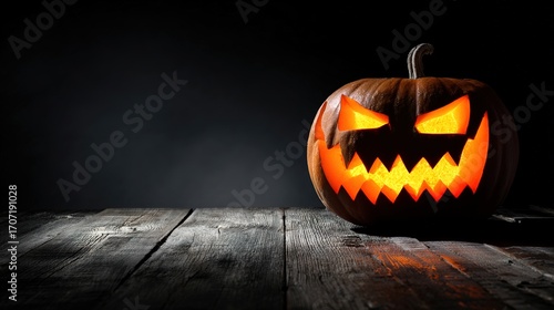 不吉な雰囲気。不気味なオレンジ色の光を放つハロウィーンのカボチャの彫刻が、風化した木の板の上に置かれ、不気味な効果を演出しています。イベントプログラム。