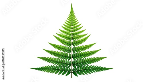 Detailed, isolated, green fern leaf featuring pinnate venation against a white background